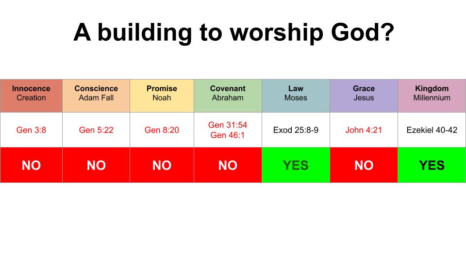While in other dispensations the altars were found in various locales, only in the Law and in the Kingdom will there be a specific building to worship God.