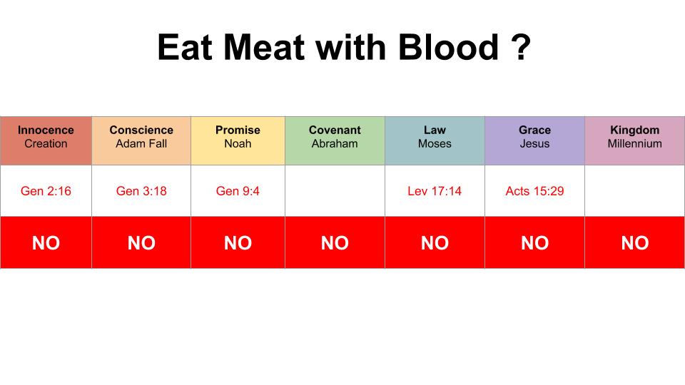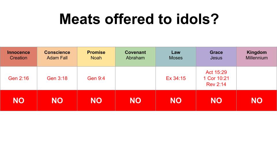 That’s right – from the Garden of Eden until the Flood – no meat was allowed to be consumed! So the first two dispensations could offer sacrifices but not partake of the meat of the sacrifice.
